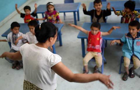 Zhou Lina, the only Han-ethnic teacher at a bilingual kindergarten at Atushen in Xinjiang Uygur autonomous region shows her students how a bird flies.