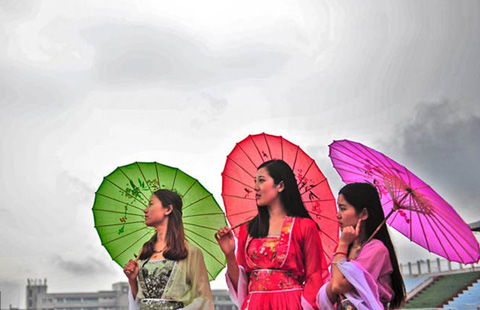 Students wearing Hanfu, the traditional costume of the Han Chinese, pose for a photo in Qingdao University of Science & Technology to celebrate their graduation.