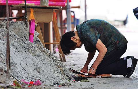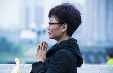 A woman prays for her child in the rain outside the examination site of the national college entrance exam in Jilin, Northeast China's Jilin province.