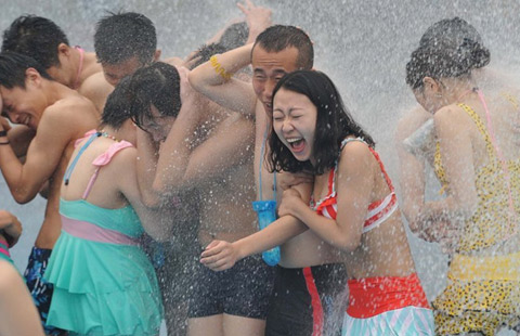 People have fun at a water park in Wuhan, Central China's Hubei province, June 8, 2014, as the city sees high temperature over 30 degrees Celsius during the past days.