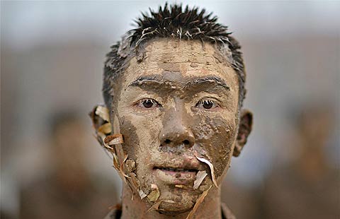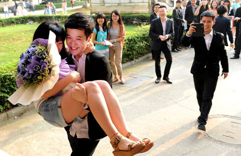 A graduate holds a bouquet and kneels in front of a girl as onlookers gather in Wuhan, Central China's Hubei province. The students from Hubei University of Economics reveal their feelings to their girlfriends ahead of May 20, the date being homophonic with "I love you".