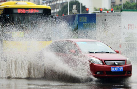 Three cars drive during a downpour in Guangzhou, capital of Guangdong province, on May 18.[Photo/Chinanews.com]