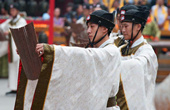 Les participants portent des costumes traditionnels lors d'une cérémonie rituelle marquant le 2566e anniversaire de Confucius.