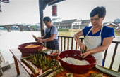 Les employées d'une boutique font des zongzi pour accueillir la fête des Bateaux-Dragons dans la ville ancienne de Tangqi de la province du Zhejiang.