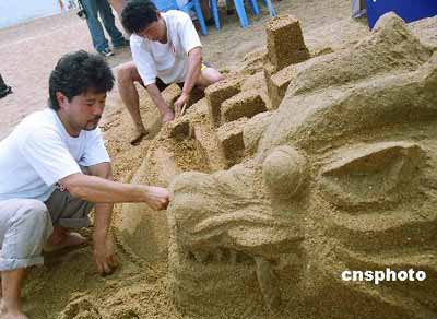 A sand sculpture contest for common people was held in Dalian, Liaoning August 5, 2006, drawing many common sand sculpture lovers.[Photo: Chinanews.cn]