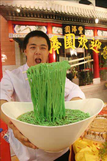 A cook shows a model of green noodle at a food exhibition held at the Beijing