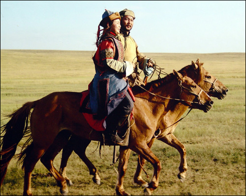 Young rural couple riding horses of the same color.[Photo by CRI]