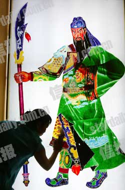 A staff member from a Shadow Play Museum cleans the over-2-meter high puppet of Guan Gong on Wednesday, May 23, 2007. [Photo: stardaily.com] |