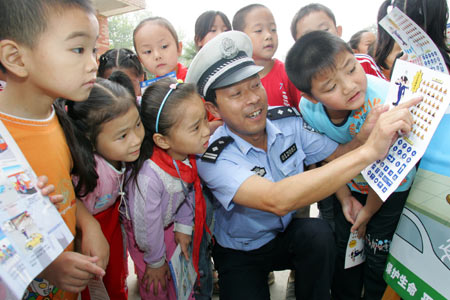 A policeman teaches students traffic safety knowledge at an elementary school in Xi'an, capital of northwestern China's Shaanxi province, on Saturday, September 1, 2007. Traffic policemen in Xi'an went to schools to publicize traffic safety knowledge in the beginning of the new semester. [Photo: Xinhua/Yuan Jingzhi]