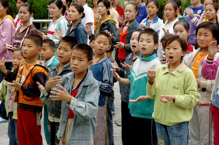 Pupils sing national anthem in gesture language in the Special Education Center in Xuzhou, eastern China's Jiangsu province, on Saturday, September 1, 2007. [Photo: Xinhua/Li Ming]
