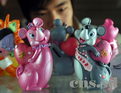 A cute mice couple carrying Chinese characters "Love" (L) and "Attached" (R) attracts customers on Wednesday, February 13, 2008 in a gift shop in Tancheng County in eastern China's Shandong Province. [cns.sd]