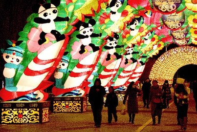 The photo, taken on Tuesday, February 12, shows Olympic Fuwa lanterns displayed on a street in Hami city in northwestern China's Xinjiang Uygur Autonomous Region. These special lanterns are prepared for the upcoming traditional Lantern Festival which falls on February 21, 2008, and have attracted a large number of visitors. [Xinhua]
