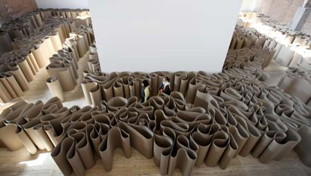 People walk through the maze constructed by chipboard leading to the exhibition hall to view the Mirror Art Exhibition in Beijing, February 23, 2008. Mirror Art Exhibition, produced by Italian artist Michelangelo Pistoletto, recently opened at the city's Dashanzi Art District. [Xinhua]