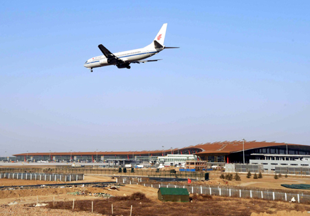A plane flies past Beijing International Airport's new terminal on the outskirts of Beijing February 26, 2008. [Xinhua]