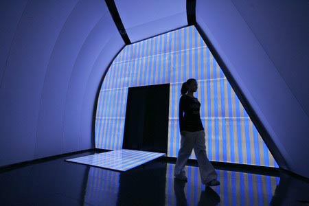 A woman walks past an artwork called "Untitled 2008" by French artist Daniel Buren at the futuristic pavilion created by British-Iraqi deconstructivist architect Zaha Hadid for Chanel's "Mobile Art" exhibition, in Hong Kong's Central district February 26, 2008. Hong Kong, Tokyo, New York, London, Moscow and Paris are the stops of the international tour, exhibiting the works of 20 international contemporary artists. [ Agencies]