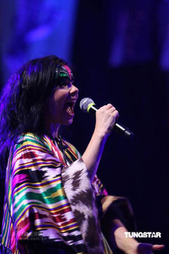 Icelandic musical dynamo Bjork performs at Shanghai International Gymnastic Center as part of her "Volta" world tour, on Sunday, March 2, 2008. Shanghai was the only Chinese mainland city on the singer's itinerary. She played in Hong Kong days earlier. [Photo: Tungstar/ent.sina.com.cn]