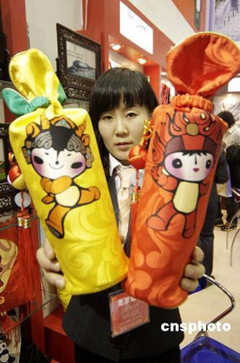 A staff member displays the Olympic mascots-themed gifts in the China International Gifts, Crafts, Home &Living Articles Exhibition at the Beijing International Trade Center on Monday, March 10, 2008. [Photo: cnsphoto]