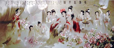 Photo taken on March 13, 2008 shows a giant silk embroidery artwork in Suzhou of east China's Jiangsu Province. The 3.6 by 1.4 meter artwork, consuming a total length of 4 million meters of silk thread, is completed on Thursday after 9 embroiderers' one whole year's work. [Photo: Xinhua]