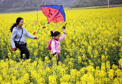 A mother and her daughter fly a kite in Guizhou in southwest China to enjoy the coming of spring on Sunday, March 30, 2008. [Xinhua]