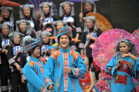 People of the Zhuang ethnic group sing during a celebration for the traditional festival "San Yue San", meaning the third day of the third month according to the Lunar calendar, in Wuming County, South China's Guangxi Zhuang Autonomous Region, April 8, 2008. The festival is also celebrated by many other ethnic groups in China. [Photo: Xinhua]