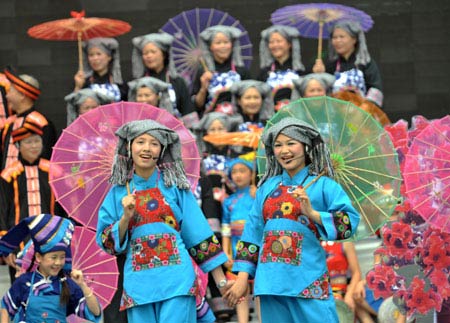 Women of the Zhuang ethnic group sing during a celebration for the traditional festival "San Yue San", meaning the third day of the third month according to the Lunar calendar, in Wuming County, South China's Guangxi Zhuang Autonomous Region, April 8, 2008. The festival is also celebrated by many other ethnic groups in China. [Photo: Xinhua]