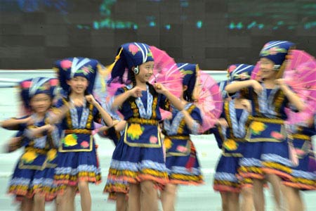 Women of the Zhuang ethnic group sing during a celebration for the traditional festival "San Yue San", meaning the third day of the third month according to the Lunar calendar, in Wuming County, South China's Guangxi Zhuang Autonomous Region, April 8, 2008. The festival is also celebrated by many other ethnic groups in China. [Photo: Xinhua]