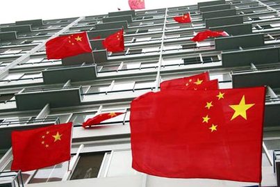 A photo taken on April 21, 2008 shows national flags waving from a dormitory in Beijing Institute of Technology. [ China Foto Press]