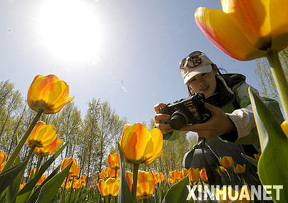 A tourist captures the beauty of the tulips in photos at a tourist resort in Wujiaqu city of northwest China's Xinjiang Uygur Autonomous Region on Tuesday, April 22, 2008. The third tulip flower festival will start on April 28 in the city, with 600,000 tulips in over 100 varieties vying to impress visitors. [Photo: xinhuanet]