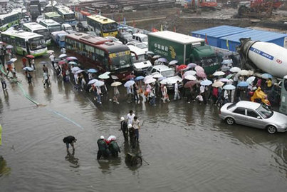 Workers drain out rain water from a road in Wuhan, Hubei Province on May 3, 2008. [Photo: China Foto Press]