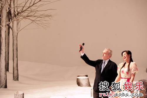 Acclaimed Spanish tenor Jose Carreras (L) works with Chinese soprano Wang Lida during the filming of a music video for an environmental campaign in Beijing on Sunday, May 11, 2008. [Photo: yule.sohu.com]