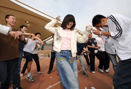 Students play stress-relief games at Yucai School in Shenyang, capital of northeast China's Liaoning Province, May 10, 2008. [Photo: Xinhua]