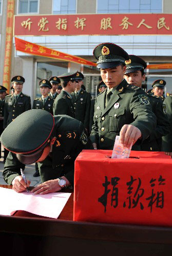 PLA soldiers in Inner Mongolia donate money for quake-hit victims in Sichuan Province on Tuesday, May 13, 2008. [Photo: Xinhua]