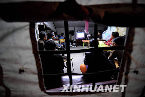 Middle school teachers and their family watch TV in a rescue tent in Li County, southwest China's Sichuan Province on June 7, 2008. Most residents in disaster-ridden areas are now living in tents and are provided with food and drinking water. [Photo: Xinhua]