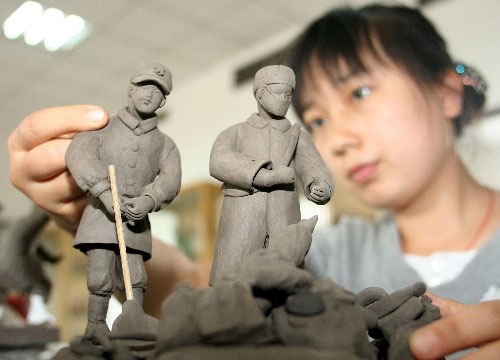 A craftsman polishes clay figures at the Huishan Clay Figure Factory in Wuxi, east China's Jiangsu Provinc, on June 12. The clay figures depict the rescue and relief efforts after the May 12 earthquake. Huishan clay figures are a time-honored Chinese folk art admired for their succinct designs, bright colors and vivid images. [Photo: Xinhua]