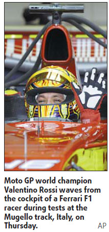 Updated: 2008-11-22 07:56 ROME: Motorcycling world champion Valentino Rossi said he believed he could become a top Formula One driver after impressing while testing a Ferrari on Thursday. The Italian has previously tested a Ferrari F1 car amid speculation that he may one day switch from racing motorbikes to cars. He has already proved more than capable on four wheels, finishing second at the invitational Rally of Monza last week behind three-time Le Mans winner Rinaldo Capello.