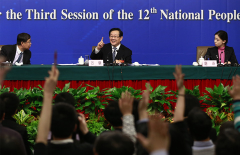 A woman crushes bamboo in an ancient papermaking workshop in Xinglong village, Fengjie county, Southwest China's Chongqing municipality, March 9, 2015. The workshop is near the Jiupan River and uses power generated by water wheel. It is the best preserved workshop in the Three Gorges Reservoir area employing the most original production processes. [Photo by Rao Guojun/Asianewsphoto] |
