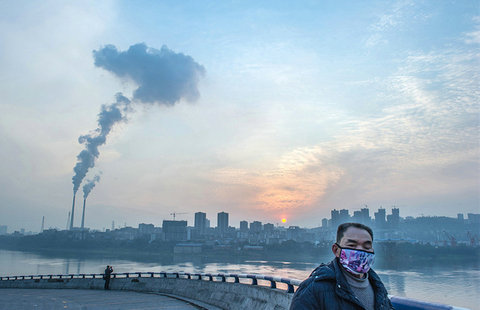 A man wearing a mask walks over a bridge.The chimney of power plant behind is discharging smoke in the municipality of Chongqing, Southwest China. [Photo by Liu Song] |