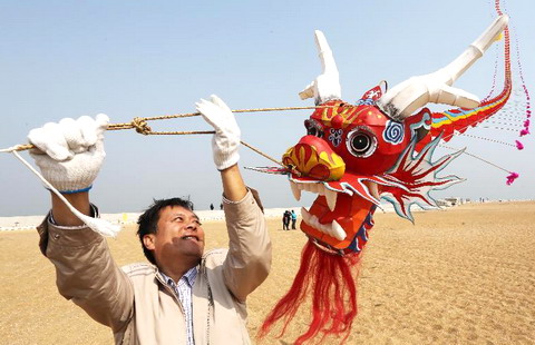 A participant flies a kite during a kite fair held in Weifang, East China's Shandong province, April 11, 2015. A total of 85 teams from all over the Weifang city took part in the fair on April 11. [Photo/Xinhua]