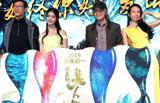 Hong Kong director and comedian Stephen Chow (second from right) attends a reception for the release of the theme music for The Mermaid, a sci-fi comedy, on January 18 in Beijing. [Photo by Jiang Dong/China Daily]