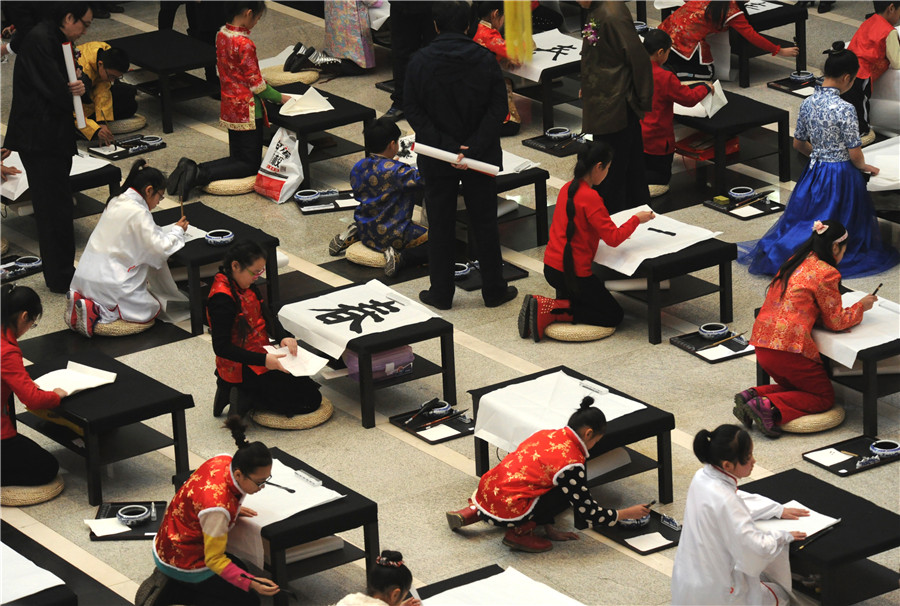 A group of youngsters participate in a "spring" themed calligraphy competition in Dalian, Liaoning province on Feb 20, 2016. The competitors are required to choose one of four different styles of calligraphy, including regular script, clerical script, seal script or running script. Then, they are tasked with printing the Chinese character for "spring" or verses with a theme that is appropriate for the season. [Photo/CFP]