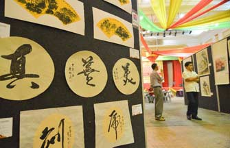 Paintings titled "Crazy Horse Car Door" and in the background, "Kissing Coppers", by the British street artist Banksy, are seen on display at LMNT Gallery in Miami, Florida February 18, 2014. Banksy is auctioning off his famous Kissing Coppers piece at a street art auction in Miami on Tuesday night. Kissing Coppers originally appeared on the side of the Prince Albert Pub in Brighton, England. The wall, weighing about 7,000 pounds, is one of several pieces to be displayed at Fine Art Auctions Miami. [Photo/Agencies] |
