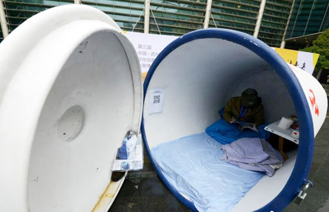The 3rd China Suzhou International Cultural and Design Industry Fair kicked off on April 19, 2013. A large enamel mug with the red slogan "Serve the People" written on it has attracted many visitors. The enamel mug, that contains a bed, desk and other living goods, was made by the artist Cai Xiaoxiao. During the fair, Cai will stay in this snail house except when he has to go to the toilet. It is through these efforts that he advocates low carbon environmental protection ideas.