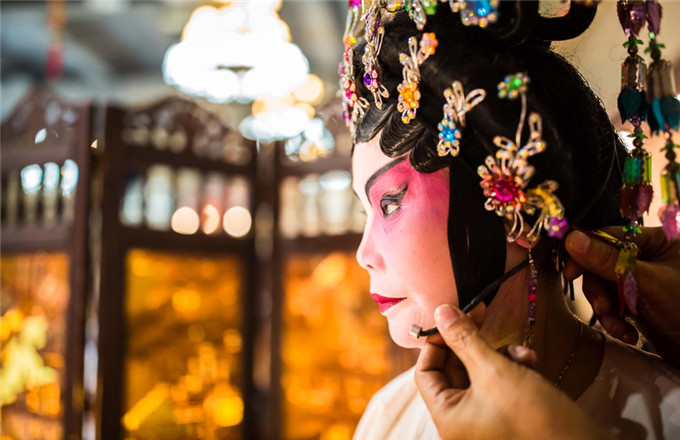 Liu Dake, who plays the role of Faust, puts on makeup backstage before the performance of experimental Peking opera "Faust" in Rome, Italy, March 12, 2017. Experimental Peking opera "Faust" was staged at the Argentina Theater in Rome on Sunday. Chinese and Italian composers adapted Johann Wolfgang Goethe's masterpiece "Faust" for Chinese traditional Peking opera. [Photo/Xinhua] |