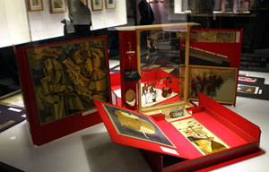 Marcel Duchamp's Boite-en-valise, a portable museum, literally translated "box in a suitcase", consists of miniature reproductions of his key works.