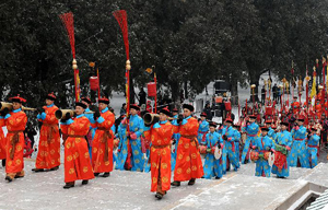 Performers dressed in costumes of the Qing Dynasty (1644-1911) act during a rehearsal of a performance presenting the ancient royal ritual to worship heaven at the Temple of Heaven in Beijing.