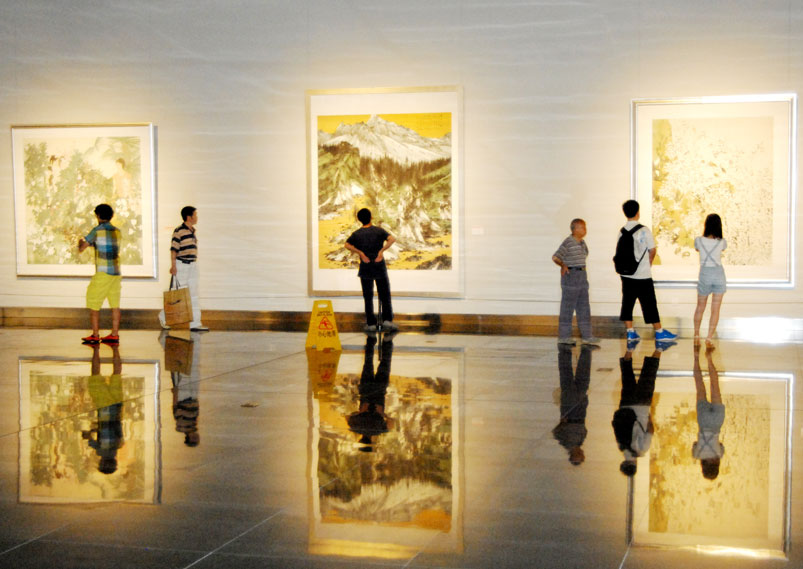 • 十七屆六中全會2011年10月15日至18日在北京舉行,審議通過《中共中央關于深化文化體制改革、推動社會主義文化大發展大繁榮若干重大問題的決定》。圖為2012年7月6日,南京,觀眾在江蘇省美術館欣賞展出的作品。(王躍武 攝)