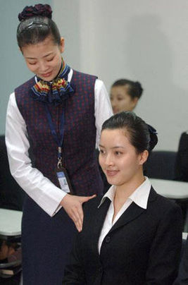 嚴(yán)格訓(xùn)練展示美麗笑容 心理培訓(xùn)也是奧運(yùn)空乘學(xué)員的重點(diǎn)學(xué)習(xí)內(nèi)容。負(fù)責(zé)客艙服務(wù)訓(xùn)練的國(guó)航培訓(xùn)經(jīng)理金紅光告訴記者:“空乘人員不僅要了解旅客的心理,也要及時(shí)調(diào)整自己的心態(tài)。”以殘障旅客服務(wù)為例,空乘人員不能熱情過(guò)度讓殘障旅客感覺自己很弱勢(shì),而要細(xì)心觀察旅客的行動(dòng)能力,在需要的時(shí)候、經(jīng)旅客同意再提供攙扶等幫助。 國(guó)航客艙部王小倫經(jīng)理透露,300名奧運(yùn)空乘將有一半留在北京基地,另一半分配到國(guó)航成都、浙江、天津、上海等基地或分公司,其中的佼佼者還會(huì)選派到奧運(yùn)包機(jī)上服務(wù)。