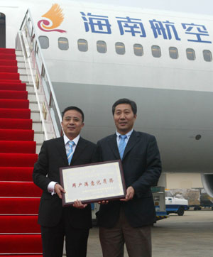 中國日報(bào)網(wǎng)環(huán)球在線消息:2009年1月23日,記者獲悉,在中國民航協(xié)會用戶工作委員會召開的“2008旅客話民航用戶評價結(jié)果發(fā)布會”上,海南航空再次榮獲“旅客話民航”活動年度旅客運(yùn)輸量500-2000萬人次組評比“用戶滿意優(yōu)質(zhì)獎”。這是海航連續(xù)獲得此項(xiàng)殊榮的第十個年頭。1月23日下午,海航HU7182航班緩緩降落海口美蘭機(jī)場,海航總裁助理胥昕手捧獎杯走下客艙舷梯,受到海航副總裁牟偉剛及各部門領(lǐng)導(dǎo)員工的夾道迎接,在場人員喜悅之情溢于言表,場面溫馨而熱烈。