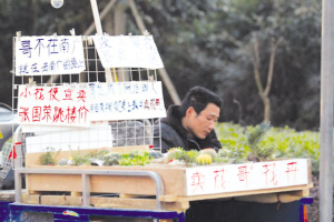 “我平時有空就去上網,這些都是我從網上看來的。”賣花哥說,“以前每天最多賣上一二十盆,自從掛上網絡標語給自己做廣告,平均每天就多賣了一倍。”去年嘗到甜頭的他,今年就越發不可收拾,將網絡流行語在自己的花車廣告發揮得淋漓盡致。“什么最流行,我就寫什么,什么最火,我就寫什么。”賣花哥承認,自己的名號,也是看到網上各種“哥”成風,自己取的。