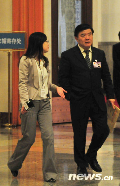 3月11日,十一屆全國人大三次會議和全國政協十一屆三次會議繼續召開。圖為新華社記者邀請衛生部部長陳竺到媒體區接受采訪。新華網孫巍 攝